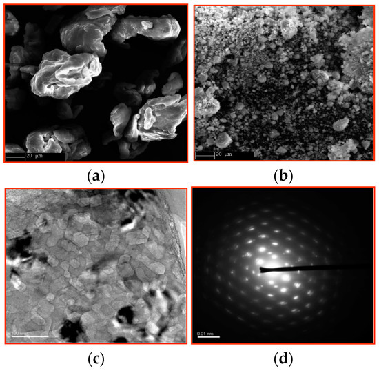 (a)—As received MgH2 SEM picture, the mean grain size is about 40 μm; (b)—SEM picture after 10 h ball-milling, the mean particle size ranges from 0.2 to 10 μm; (c)—HREM picture of a 6 h ball-milled MgH2, defects and nano-crystalline state transform to well-shaped homogeneous size crystals after hydrogen release under the electron beam; mean grain size ~20 nm; (d)—Electron diffraction picture of insitu well recrystallized Mg from the MgH2 precursor.