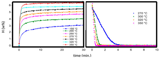 Traces recorded at various temperatures of activated MgH2 powders by HEBM, Left: absorption made under 1 MPa H2 pressure, Right: desorption made under 15 kPa H2 pressure.