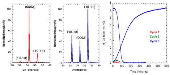 Presently, a novel micro-structuration route is under development based on the severe plastic deformation by fast forging bulk samples of specifically formulated Mg-rich compounds [34,35,36]. This will allow less time and less energy consumption, namely the comparison made with the HEBM process. As a consequence, implementation of the production will be made under safer procedures. Figure 6 shows the A/D sorption traces of forged Mg-based materials when undertaken at the lab-scale as shown in Ref. [37].