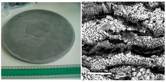 Left—compacted disc of MgH2 composite (ϕ = 30 cm, e ~1 cm) storing 650 Nl hydrogen gas; Right—SEM picture of a section of disc giving evidence that the NGE ribbons are aligned perpendicular to the vertical pressing axis, made to have better radial thermal conductivity.