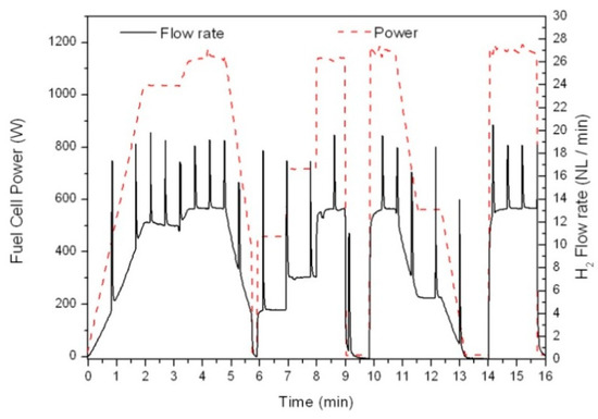 The trace of hydrogen flow (Nl/min) directly outing from the adiabatic-type tank (black) follows the power (W) demand at the fuel cell control panel (red dashes) exactly and instantaneously. The spikes correspond to the automatic N2 flushes needed on the FC membrane. Note that the tank automatically provides the FC with hydrogen without any mass flow; no more heaters are needed at the tank outing.