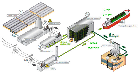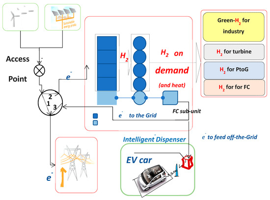 b—hydrogen distribution via both solid-state storage units and heat storage in safe and dense mode,