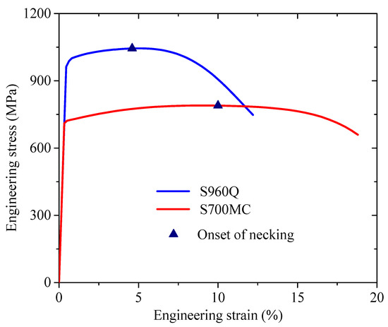 Engineering stress–strain curves of S700MC and S960Q (according to [26]).
