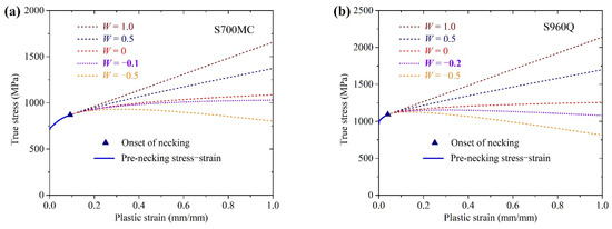 Figure 3 shows the full-range true stress-plastic strain curves of S700MC and S960Q, in which the pre-necking portion was converted from measured engineering stress–strain relation using Equations (1) and (2), and the post-necking portion was based on Equation (3) with various values for weighting for W. The combined linear and power law generated very smooth post-necking stress–strain curves following the pre-necking ones. The lower bound exponential law with weighting factor W = 0 yielded a slowly increasing post-necking stress–strain curve for both HS steels. In this paper, the combined linear and power law was used to describe the post-necking stress–strain relations of S700MC and S960Q, in which the material damage was incorporated in the plastic behavior.