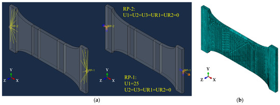 Tensile experiments on plate specimens were modelled using an FE analysis software ABAQUS (version 6.13, Dassault Systèmes Simulia Corp., Providence, RI, USA) [35], as shown in Figure 4. The plate longitudinal length in clamped part of FE model was only 1/5 of that in actual tests to improve the FE analysis efficiency. As shown in Figure 4a, the left and right clamping surfaces were coupled to a reference point at the respective end by all six freedoms. The freedoms of the left reference point RP-2 were fully constrained except for the rotation around Z-axis, that is U1 = U2 = U3 = UR1 = UR2 = 0. Axial displacement was applied to the X-direction of the right reference point RP-1 to simulate the tensile loading, and other freedoms were constrained except for the rotation around Z-axis, that is U1 = 25, U2 = U3 = UR1 = UR2 = 0 for S700MC. The rotation around Z-axis for left and right reference points was free since tensile coupons could slightly rotate around Z-axis due to the much weaker constraint in this direction. Mises yield criterion was used to describe the yield surface with the associated plastic flow. Quasi-static analyses on tensile plate specimens were carried out using the explicit solver in ABAQUS. Eight node hexahedral solid elements with reduced integration (C3D8R) were adopted to simulate the elastic and plastic behavior of plate specimens, as shown in Figure 4b. The target time increment was set to 0.001 s and the duration of the tensile step in simulations was 200 s. The engineering stress–strain curves from FE simulation results were obtained by postprocessing the elongated gauge length and the force in tension at each time step.