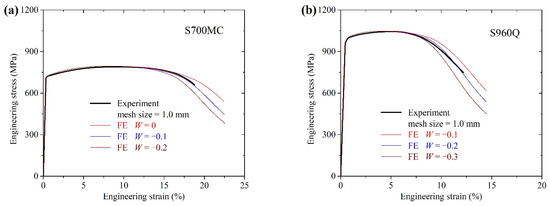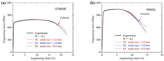 Mesh size in plate parallel parts may affect the FE simulation results since the strain localization effects in FE analysis were mesh-dependent. Cubic elements with mesh size 2.0 mm, 1.0 mm, and 0.5 mm were used in the plate parallel parts. Figure 6 shows the comparisons of the FE simulation and experimental engineering stress–strain curves for S700MC and S960Q plates with these three mesh sizes. Using mesh size 2.0 mm in parallel parts resulted in slightly larger engineering stress for S700MC and S960Q plates when plates were close to the fracture. For the simulation of S700MC with W = −0.1, FE results with mesh sizes 1.0 mm and 0.5 mm agreed well with the experimental one. For S960Q with W = −0.2, FE results with mesh size 1.0 mm agreed well with the experimental one, while mesh size 0.5 mm lead to larger engineering stress in the descending stage. Therefore, the FE simulation with mesh size equal to 1.0 mm in parallel parts of S700MC and S960Q plates were adopted in the following analysis.