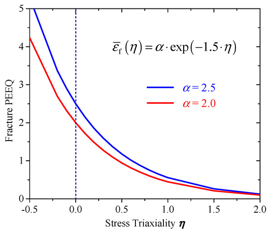 Figure 7 shows the relation between fracture PEEQ and stress triaxiality η with two fracture parameters α = 2.0 and α = 2.5. With the increase in stress triaxiality η, fracture PEEQ had a deceasing trend, and the variation of the fracture parameter α had less of an effect on fracture PEEQ. The fracture criterion of Equation (8) with fracture parameters α = 2.0 and α = 2.5 will be checked in the following analysis to predict the tensile fracture of plate specimens.