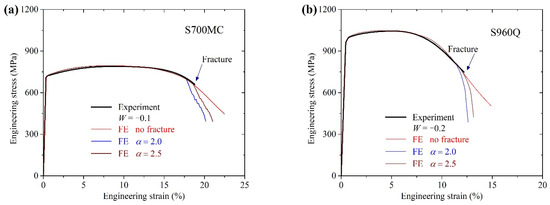 The tensile experiments on S700MC and S960Q plate specimens reported in [26] were modelled using the calibrate plastic behavior and the ductile fracture criterion. In the ductile fracture criterion, the fracture parameter α was set to 2.0 and 2.5 for both steels. Figure 8 shows the comparisons between the FE-analyzed engineering stress–strain curves and the experimental results for two steels. Considering the calibrated plastic behavior in the FE analysis generated almost the same descending engineering stress–strain curves to the corresponding experimental results. For S700MC calculations, the fracture model with α = 2.5 generated almost the same fracture engineering strain as experimental value. For S960Q calculations, the fracture engineering strains in FE results with fracture parameter α = 2.5 were close to the corresponding experimental value.