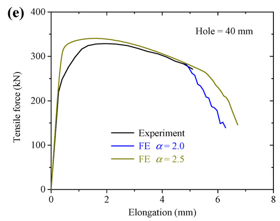 Figure 10 shows the FE analysis force-displacement curves for S960Q CH specimens compared to the corresponding experimental results. Similar to the S700MC FE analysis results, the fracture parameter α = 2.5 resulted in a larger deformation capacity for the CH specimens than using α = 2.0 in the ductile fracture modelling. The FE force-displacement curves for S960Q CH specimens agreed well with the experimental results until the initial fractures. For the CH specimen with a hole diameter of 40 mm, see Figure 10e, there were some differences between the numerical force-displacement curves and the corresponding experimental results. The numerical force-displacement curve of this specimen had the same increasing and decreasing trend compared to other CH specimens. However, the experimental force-displacement curve of this specimen in the increasing stage had a different increasing trend compared to other CH specimens. Accordingly, it was considered that there may be some experimental errors in the load-increasing stage for the CH specimen with a hole of 40 mm, resulting in the difference between the FE and experimental curves. Moreover, the experimental errors for the specimen only affect the plastic behavior and the experimental fracture behavior can still be compared with the corresponding FE prediction result. Note that the ductile fracture models calibrated in this paper were to simulate the initial fracture of the material properties. After the initial fracture of the CH specimens, the crack propagation behavior cannot be predicted accurately based on the adopted ductile fracture models.