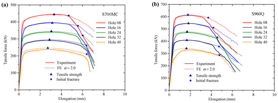 Figure 11 shows the tensile force vs. elongation curves for five groups of CH specimens. It can be seen for S700MC and S960Q specimens, the FE simulation results would accurately predict the plastic behaviors, especially for the increasing part. Therefore, the calibrated plasticity for HS steels was effective for predicting the tensile strength of CH specimens. In addition, the descending parts in the force-displacement curves were almost close to the experimental results for most specimens. For the initial fracture of the CH specimens, it can be concluded that using the ductile fracture criterion of Equation (8) with α = 2.0 would produce close predictions for the fracture deformation both for S700MC and S960Q specimens. It indicates the ductile fracture criterion of Equation (8) should be calibrated in detail for more accurate fracture prediction.