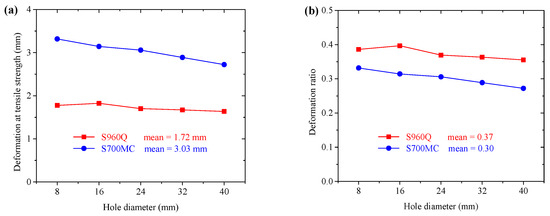 The elongations of the CH specimens corresponding to the tensile strength were compared, as shown in Figure 12. With the increase in the hole diameter, the elongations at the tensile strength had a decreasing trend both for S700MC and S960Q. Due to the better ductility of S700MC, the decreasing trend was more significant. The average deformations at the tensile strength for S700MC and S960Q CH specimens were 3.03 mm and 1.72 mm, respectively, see Figure 12a. The larger material ductility produces larger deformation at the tensile strength for CH specimens.