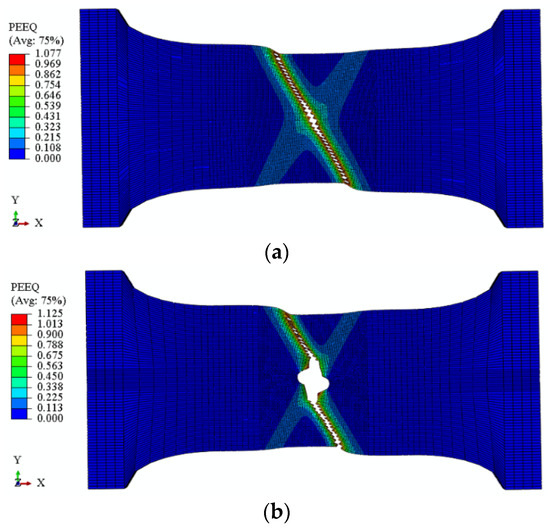 Figure 15 shows the PEEQ distributions of the S960Q plate and CH specimens at the initial fracture state. The maximum PEEQs of S960Q were about 0.85, a little smaller than that of S700MC. The necking regions for the S960Q plate at the initial fracture state had a major “I” shape instead of “X” shape for S700MC due to its higher tensile strength and lower ductility. For the S960Q CH specimens, the PEEQ distributions were similar to that for S700MC CH specimens at the initial fracture state.