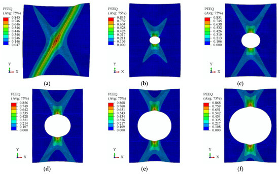 PEEQ distribution of S700MC specimens at initial fracture. (a) plate; (b) hole = 8 mm; (c) hole = 16 mm; (d) hole = 24 mm; (e) hole = 32 mm; (f) hole = 40 mm.