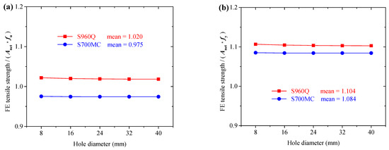 The tensile strengths corresponding to the ultimate tensile states in the FE analysis were compared to the net cross-section strength based on Equation (12) without factor 0.9 and partial factor γM2 = 1.25. Figure 16 shows the strength comparison results for the S700MC and S960Q CH specimens. The average ratios of the CH specimen FE analysis tensile strength to the corresponding equation prediction (Anet × fu) were 0.975 for S700MC and 1.02 for S960Q specimens with hole diameter from 8 mm to 40 mm, see Figure 16a. The effect of hole diameter on the ratios can be neglected. It can be concluded that the material ductility affected the tensile strength of net cross-sections, but the prediction equation in EN 1993-1-1, Equation (12), would result in rather conservative predictions. The FE analysis tensile strengths were also compared to the corresponding yield strength of the net cross-section (Anet × fu). Figure 16b shows the strength comparison results for the S700MC and S960Q CH specimens.