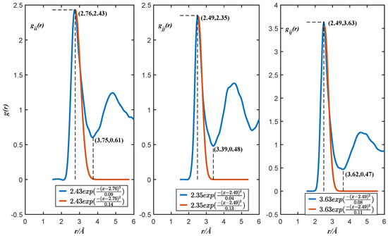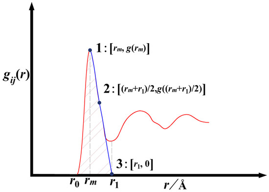 where r0 is the starting coordinate of gij(r) and is not 0; r1 is the position of the first valley of gij(r); gij(r) is the local partial pair distribution function of ij; uij and vij are found by fitting the data on the left side of the peak and the coordinates of point 2 [(rm + r1)/2, gij((rm + r1)/2)]. This same method was used to obtain the L-PPDF of molecular pairs ii and jj. Next, gii(r), gjj(r), and gij(r) = gji(r) represent L-PPDF, but not PPDF. The total number of atoms in the L-PPDF shell was defined as the local coordination number. For the i-j binary liquid mixture, the empirical equation of the local coordination number assumed by MIVM can be redefined by L-PPDF as [23]: