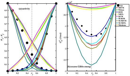 Substituting the model parameters in Table 2 into Equations (14), (17), (19), (21), (22), (25), (27), (28), and (33), the estimated values of molar excess Gibbs energy and activity by the eight equations can be achieved and compared with experiment data of the liquid Al-Cu at T = 1400 K [69], as shown in Figure 3