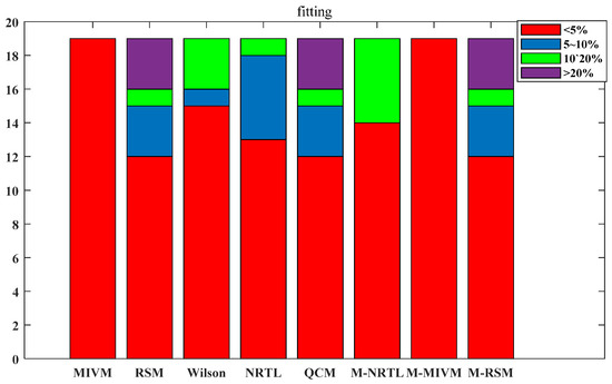 The descriptive capability of the model will be limited by its theoretical basis, and the adaptability of the model can be expressed by fitting. If the model has a poor fitting performance, it will naturally not have a satisfactory estimation performance. If the model has a poor fit performance, it cannot have a good estimation performance. Fitting analysis was conducted for the eight models, the ARD of the activities are shown in Figure 4. MIVM and M-MIVM showed superior performance in all 19 liquid alloys. The bar graphs of RSM, M-RSM, and QCM were consistent. This is because RSM, M-RSM, and QCM have different definitions of parameters, but when used for fitting, they are all essentially single-parameter models, thus exhibiting the same fitting performance. RSM, M-RSM, and QCM had three alloys with an ARD greater than ±20%: Al-Au: ±39.08%; Al-Cu: ±30.88%; Cu-Sb: ±24.94%. Their estimation performance was poor. When evaluating the estimative capabilities of the three models, the aforementioned three alloys should be excluded. NRTL, Wilson, and M-NRTL are two-parameter models, and they demonstrate well-fitting performances in most alloys with an ARD of less than ±20%, allowing for a reasonable description of the activity of all systems. The strength of the model fitting ability and the number of adjustable parameters were significantly correlated. The order of the fitting ability of the eight models was MIVM = M-MIVM > NRTL > Wilson > M-NRTL > RSM = M-RSM = QCM.