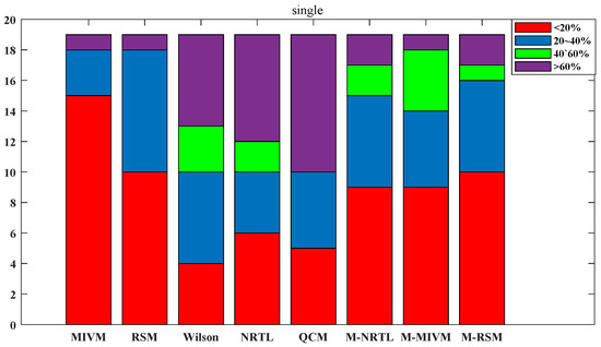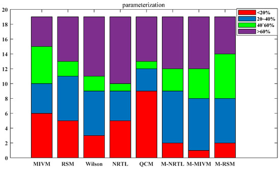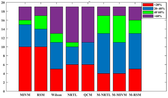 The parameters in Table S41 in the Supplemental Material were put into the model to estimate and evaluate the model’s performance when the parameter constants were manipulated. The ARDs with the best single-component estimation performance are shown in Figure 6, and the ARD with the average of the parameter values are shown in Figure 7. By analyzing Figure 6, it can be seen that MIVM achieved an ARD of less than ±20% for 15 alloys, indicating good performance. RSM and M-RSM achieved an ARD of less than ±20% for 10 alloys. M-NRTL and M-MIVM obtained an ARD of less than ±20% for nine alloys. Wilson, NRTL, and QCM estimations performed poorly, with only four, six, and five alloys having an ARD of less than ±20%, respectively. MIVM, RSM, M-NRTL, M-MIVM, and M-RSM had good estimating performance, all with a common high number of alloys with an ARD of less than ±20%, and a low proportion of alloys with an ARD greater than ±40%. The significant difference between Figure 5 and Figure 6 further confirms that representing the parameters of the above models as component functions drastically reduces the model’s estimative ability. The poor performance of the Wilson, NRTL, and QCM models is highlighted by the high proportion of alloys with an ARD greater than ±40%, indicating that the combinations of L-PPDF and these three models are still not mature enough. M-NRTL was originally an improved model of NRTL in practice. A comparison of the results of NRTL and M-NRTL revealed that the reasonableness of the model itself has an influence on the performance of the model parameters calculated using L-PPDF. Analyzing Figure 5, it shows that QCM has better estimative performance, making it reasonable to use multiple L-PPDFs and fitting regression to calculate the model parameters for QCM. However, the method of solving the model parameters by solving equations is unsuitable, indicating that the representation of parameters can also influence the estimative performance of the model.