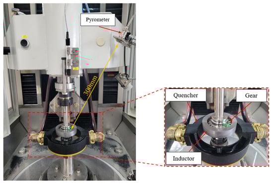 The series of induction hardening experiments under simultaneous double-frequency is performed on C45 steel spur-gears. The gear data was summarized in Table 1, while the process parameters were listed in Table 2. During these experiments, gears were mounted on a rotating chuck. The heating phase was performed by using a rectangular shape inductor of 12.25 × 20 mm having an air-gap of 2 mm, while the subsequent cooling shower of a polymer–water mixture was applied by another coaxial ring as shown in Figure 1. The temperature on the surface at the tooth root was measured using an Optris pyrometer. Micro-hardness Vickers (HV0.3) profiles were conducted in the normal direction to the surface of the gear at the tooth tip and root and on a transversal section, according to ISO 6507 norm [59], to determine the penetration hardening at these two locations.