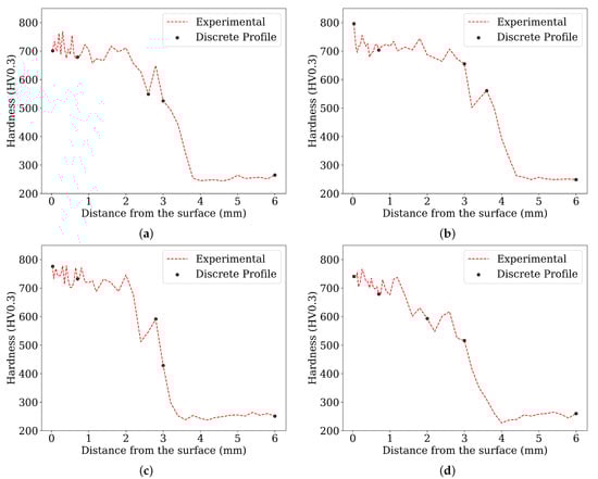 Selected hardness points from the measured hardness profiles. (a) Run #2; °C; (b) Run #12; °C; (c) Run #22; °C; (d) Run #30; °C.