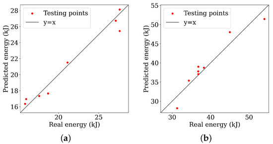Predicted versus real energy at the tooth tip and the tooth root. (a) Tooth tip; (b) Tooth root.