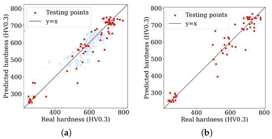 Predicted versus real hardness for forward problem in both tooth tip and root of the gear. (a) Random Forest; (b) XGBoost.