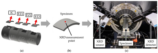 The specimens for the XRD analysis were extracted from flow formed tubes according to Figure 2a. The measurements were carried out on the outer surface of the specimens, as specified in Figure 2b. The X-ray diffractometer Bruker D8 Discover (Bruker Corp., Billerica, MA, USA) was used to perform the diffractometry analyses, the setup of which is specified in Figure 2c. According to the Bragg conditions, a change in lattice spacing induces a shift of the diffracted X-ray angle [24]. According to the crystal structure and space group of the present phases of the material, the intensity of the diffracted signals changes. Consequently, each phase produces a characteristic diffraction pattern. Additionally, when several phases are present in the material, the characteristic diffraction patterns of the phases are superimposed and the diffraction peaks of the phases are proportional to their amounts [16,25].