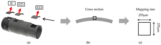 Similar to the microhardness tests, the area of interest for the EBSD investigation corresponds with the cross sections of the initial condition (IC) and only the forming zones 1 and 3 (FZ1 and FZ3) of Specimen 1. The specimens were extracted from the flow formed tubes (Figure 3a) and underwent metallographic preparation. The EBSD investigation was carried out on cross sections, close to the outer surface of the tubes (Figure 3b). Phase and Inverse Pole Figure (IPF) mappings, 255 × 255 µm2 in size (Figure 3c), were measured for the analyses. Both kinds of mappings are presented superimposed on image quality (IQ) mappings. IQ in the background shows the quality of the diffraction patterns during the EBSD measurements which allows grain boundaries or areas with high degrees of deformation to become visible.