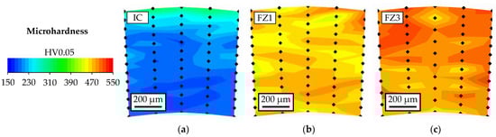 Microhardness mappings of (a) metastable austenite, initial condition (IC); (b) deformation-induced martensite, forming zone 1 (FZ1); (c) forming zone 3 (FZ3).