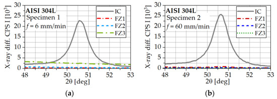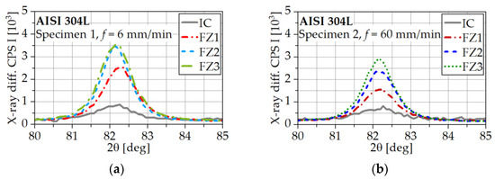 The next peak in Figure 6 with a remarkable intensity is the one at 2θ = 82.329°, which corresponds to the Miller index M(211) for martensitic steel, according to Table 1. Figure 8 shows details of the distribution of the diffraction peaks of the different forming conditions of both specimens. As expected, the measured peaks for IC on both specimens are around 0.8 × 103 CPS, which is low in comparison with the peaks for the different FZs. The recorded signals of martensitic phases in IC are explained by the fact that the austenitic phase is not completely pure at IC, but does have some ferromagnetic phases, as shown in the pictures of Figure 4a.