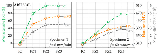 Figure 9 illustrates the results of Table 2 in correlation with the XRD measurements with α′-martensite amounts and the macrohardness measurements. The graphs display the strain hardening of the specimens due to the phase transformation from austenite to martensite. Martensite is well known as a very hard phase [27]. The higher the amount of α′-martensite, the harder the microstructure. The hardening of both specimens is proportional to the measured amount of α′-martensite. The quantitative results of the macro- and microhardness, shown in Figure 5, differ slightly from each other. While it is true that the microhardness measurements deliver reliable information on the local hardness distributions, it is a time-consuming and complex characterization technique. In contrast, macrohardness measurements can be carried out quickly, but the recorded information only illustrates the hardness in a global way. An indented point may correspond to a zone of higher or lower hardness since the distribution of properties after the forming process is not completely homogeneous.