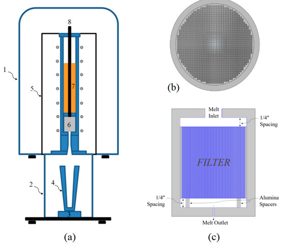 The schematic views of the experimental setup, adapted from references [10,13,15]: (a) The experimental apparatus: (1) Furnace Dome, (2) Lower Chamber, (3) Load Cell, (4) Metallic Mold, (5) Furnace setup, (6) Alumina Filter, (7) Steel Melt, (8) Alumina Stopper Rod, (b) the cemented monolithic filter used in the experiment, and (c) the filter setup.