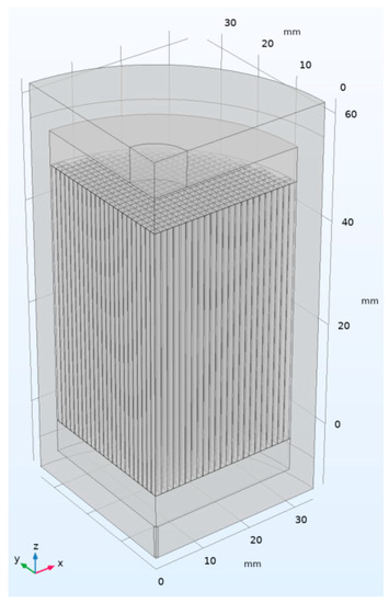 To evaluate particle entrapment using CFD and to compare the results to the previous experimental findings, a three-dimensional model representing the experimental filtration setup was created. The model simulates a perfectly sealed filter where no gap exists between the filter holder and the filter media. Recently, it was shown that the filters need to be properly sealed to prevent fluid bypassing [37]. In addition, to avoid simulation and convergence complications, it was also assumed that the filter is made as part of the alumina crucible. Therefore, the alumina spacers shown in Figure 1c were neglected in the CFD model. The model was created according to the actual filter setup and experimental apparatus dimensions, as shown in Figure 1 and Table 1 and as explained elsewhere [10,13,15]. In addition, the filter matrix; particle and fluid properties, e.g., particle density, fluid density, and fluid temperature; and dynamic viscosity were set according to the experimental conditions presented in Table 2 and explained elsewhere [10,13,15,38].