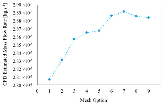 To obtain the optimum mesh for the CFD modeling, several mesh options were configured, and the effects of mesh element sizes on mathematically obtained mass flow rates at a given outlet velocity were compared. A summary of the selected mesh parameters, including the selected mesh type, minimum and maximum element sizes in the domains and boundaries, the total mesh element, and calculation time, are presented in Table 5. The obtained estimated mass flow rates for each mesh option are illustrated in Figure 3. The CFD-estimated mass flow rate obtained with mesh option 7 provided the optimum mesh. At this point, the average mass flow rate did not improve with further mesh refinement, as shown in Figure 3. Therefore, the solution was considered to be independent of the mesh size. Thus, mesh option 7 was selected for the remaining mathematical modeling work.
