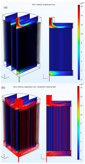 CFD predicted steel flow properties in the filter setup: (a) Velocity magnitude, (b) Velocity streamline.