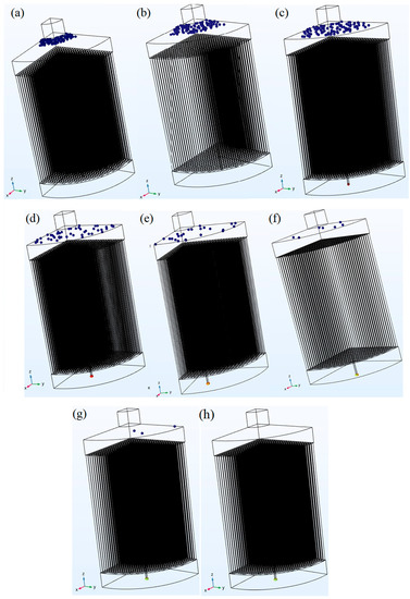 Particle trajectories of the 100, 70, 50, 30, 20, 10, 5, and 1 µm alumina inclusions were studied independently of each other. In each study, 100 particles were released at time zero from random initial positions at the inlet due to the fact that their distributions were reported to be non-uniform [13]. The particle trajectories were mathematically calculated using Equation (6). Meanwhile, the required preliminary data, e.g., the fluid density, the fluid viscosity, and velocity at each grid point, were provided by the initially solved fluid flow study step. Enough time was given until there were no active particles in the system, i.e., particles were either stuck in the filtration setup or had left the system from the outlet. The required time given to the unsteady particle tracing step was found by trial and error. The predicted particle removal rates, i.e., the percentage of the particles removed from the simulated molten steel by the simulated filtration setup, is illustrated in Figure 5 as a function of particle size. Figure 6 illustrates the position of the particles when there was no active particle in the system. It can be observed in the figures that 100% of the particles larger than 50 µm were captured by the filtration setup. Almost all 50 µm particles were also captured, but from this point, as the particle size decreased, the particle removal rate also declined. The non-captured particles traveled through the filter pores and channels and continued along the streamline toward the outlet.