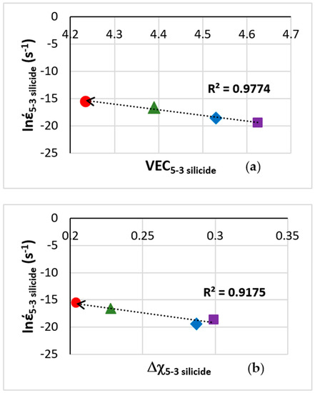 In Figure 5, the arrow points in the direction of increasing creep rate for (Nb, TM)5(Si, X)3 at the given temperature and stress. There is no experimental data about the creep of Nb5Si3 where only Si is substituted by Ge or Sn, i.e., for Nb5(Si, Y)3, where Y = Ge, Sn. In this case, we know that the Δχ versus VEC map shows a different alloying behaviour of the latter silicides, meaning the change of alloying behaviour is in the opposite direction compared with the Ti-alloyed Nb5Si3 (see Figure 6 in [27] and Figure 11 in [40]). Currently, there is no experimental data for the creep of Nb5(Si, Y)3 silicides. In other words, we do not know whether the creep rate of these silicides also would increase with increasing temperature and stress. If creep experiments were to confirm this not to be the case, then I would like to suggest that further experimental work on the creep of tetragonal Nb5Si3 where Si is substituted with other simple metal and metalloid elements, namely with Al or with Al plus Ge or Sn, Ge + Sn or Al + Ge + Sn, and Nb with RMs (Mo, Ta, W) or Cr but not Hf or Ti, is essential.