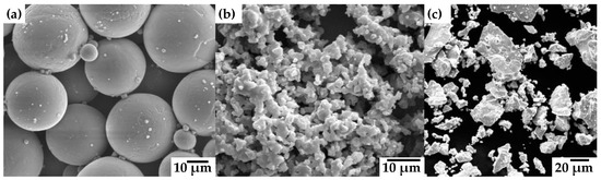 Ti (AP&C, Boisbriand, QC, Canada), Ta and Nb powders (CRM, Jiangxi, China), with particle size distributions of lower than 20 µm for Ti and Ta and lower than 100 µm for Nb, were used to prepare the samples, see Figure 1. The shape of Ti powders is spherical, meanwhile the shape of Ta powders is irregular as is the shape of Nb powders, as can be noticed in Figure 1. A mixture of 75 wt.% Ti with 12.5 wt.% Ta and 12.5 wt.% Nb was prepared in a dry condition with the aid of a turbula mixer (WAB, Sausheim, France). The mixture was obtained after 30 min. Then, 1 wt.% of polyvinyl alcohol, PVA (Merck, St. Louis, MO, USA) was added to the powder mixture as a binder. After that, the mixture was poured into a 6 mm diameter steel die and pressed with a maximum pressure of 450 MPa with a displacement rate of 0.1 mm/min, using an Instron 1150 universal mechanical testing machine (Instron, Norwood, MA, USA). The green density of samples was estimated by measuring the volume of cylindrical samples with a digital caliper (Mitutoyo, Kanagawa, Japan) and weighting them in a balance (Ohaus, Parsippani, NJ, USA). of high accuracy (0.0001 g). The dimensions of green compacts after powder compaction were around 4 mm height and 6 mm diameter.