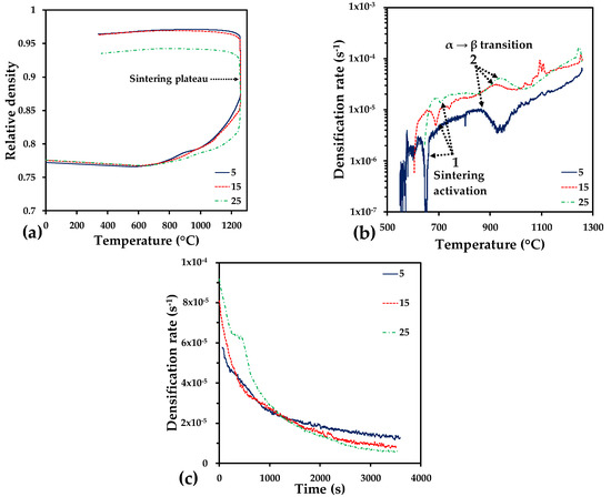 Densification of samples heated at different rate was followed during the thermal cycle. Relative density of samples was barely the same at the beginning (77%), then, a reduction in relative density was noticed due to the thermal dilation, Figure 2a. Then, a continuous increment in relative density was observed from 686 °C, which indicates the activation of sintering. The activation temperature varied from 686 to 706 °C as the heating rate increased from 5 to 25 °C/min. This is also confirmed by a sharp increment in the densification rate in Figure 2b (point 1).