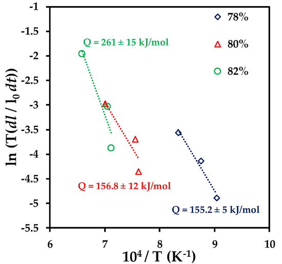 Arrhenius plot of ln (T (dl/l0dt)) versus the inverse of absolute temperature (T) at different relative densities.