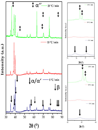 The microstructure of Ti12.5Ta12.5Nb sintered samples is composed of α, β, α′ and α″ phases, which depends on the heating rate used. As the Ta and Nb are β stabilizer elements, a great amount of these phases are found after sintering. The identification of peaks in the X-ray diffraction patterns (Figure 4) corresponding to the different phases were based in previous works of Ti-Ta, Ti-Nb and Ti-Ta-Nb alloys [34,35,36,37,38,39,40]. It was interesting to found that microstructure of samples sintered at 25 °C/min is mostly composed of β-Ti and the martensite phase α″-Ti. Meanwhile, the β-Ti is reduced as the heating rate does it, finding a microstructure composed by α-Ti, β-Ti and the martensite phase of α’-Ti in similar proportions.