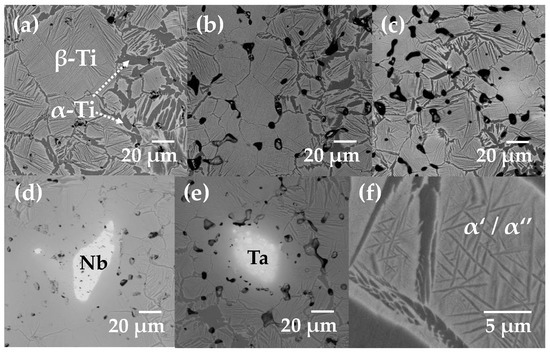 The microstructure of the Ti12.5Ta12.5Nb shows β-Ti grain with α-Ti segregated at the grain boundaries no matter the heating rate used, Figure 5. Two main features can be distinguished from SEM images generated by the heating rate; the first one is that more pores can be observed as the heating rate increased, Figure 5a–c. However, all pores seem to be isolated and with nearly spherical shape, which confirms the high relative density measured by dilatometry. The second is that grain size seems to be larger as the heating rate slowed, Figure 5a–c. This could be associated with the isothermal sintering, because the sample heated at the lowest rate reached the sintering plateau at a high relative density, thus, most of the isothermal sintering allows grain growth. The grain size was quantitatively measured from a few backscattering SEM images by using the image J software and taking to account the Ferret diameter. As the α-Ti phase is located at the grain boundaries, the difference in contrast generated in the images allows to find the grain limits. It was calculated that the average grain size increased from 47 to 64 µm (Table 1) by reducing the heating rate from 25 to 5 °C/min. The grain size is also influenced by the diffusion of Ta and Nb into the Ti since they stabilize the β. From Figure 5d,e, it is possible to note that close to the Nb and Ta particles the main phase is β, however, a lamellar microstructure starts to be appreciated as the distance from the Ta and Nb particle is made. This was expected, since the diffusion of Ta or Nb is low to homogenize the whole sample during sintering. Another important finding was that martensitic phases nucleated inside the β phase, as shown in Figure 5f. This fact confirms the X-ray diffraction patterns. The martensite phases are obtained during cooling after sintering, because the Ta and Nb atoms inhibit the transition from β → α, so a great amount of martensite phases could be obtained without a quenching treatment. The quantity of β and α phases was also estimated from the SEM images. The quantification was performed by segmenting the gray level in SEM images by using the image J software. In where, light grey is the β phase and the dark gray are the α, α′ and α″ phases. Unfortunately, this method does not separate α, α′, and α″ phases because they show similar grey intensity in the images as the α phase, as discussed, and thus, it is not possible to quantitatively measure the martensitic phases from SEM images. It was found that β-Ti increased with the heating rate, see Table 1. This could be due to the mobility of Ta and Nb atoms inside the Ti cell since most of the time is needed to homogenize the microstructure. Thus, higher heating rate reduced the time of the whole sintering cycle, which generates Ta-rich zones of Ta and Nb atoms. This stabilizes the β phase during cooling or inhibits the complete transition β → α obtaining the metastable martensitic phases.