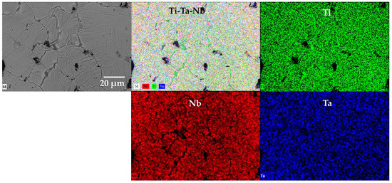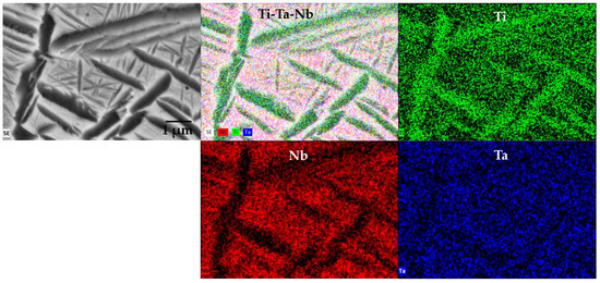 In order to determine the reason of martensitic phase formation an EDS mapping inside of the β-Ti grain was performed. The needle-like microstructure of the martensitic phases can easily be distinguished from Figure 7. As it can be noticed, the Ti is predominant in the thick lamellas (dark gray), which confirms that those are α phase. On the other hand, the composition of the β phase and the martensitic phase show Ti, Ta and Nb distribution that confirms the above discussed. Therefore, the formation of martensitic phases is linked to the Ta or Nb content more than the cooling rate used, as it was reported before [36,41,42,43]. Thus, the heating rate during sintering plays an important role in the final microstructure, because the longer the thermal cycles, the better Ta and Nb particles diffuse, reducing the formation of martensitic phases.