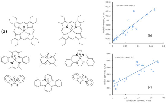 Vanadium and nickel compounds in crude oil are called “molecular fossils” due to their origin from heme and chlorophyll. Just as in living cells, in petroleum they are found in various coordination complex compounds, with metal porphyrins being the most known (Figure 1). The polyaromatic structures are flat and interact favorably with other polyaromatics via dispersion and π–π forces. Polyaromatic asphaltenes form the most hydrophilic fraction of crude (e.g., [14]), and the metal-containing complexes shown in Figure 1a are more hydrophilic in comparison with typical asphaltene molecules. In oil–water emulsions, they are located near the oil–water interface, which is important in some prospective recovery processes. In general, the metal content in crude oils increases with the density (and with the asphaltene content, correspondingly) [15]. The vanadium content grows with density faster than the nickel content (Figure 1b). Upon de-asphalting with heptane, most metals remain with the asphaltene fraction: vanadium content reached 1% of the total asphaltene mass precipitated from the heaviest oil samples (Figure 1c) [15]. As the asphaltene content in the petroleum feedstock increases, more effort has to be invested in demetallization, and in turn the demetallization waste becomes more valuable as a source of metals.