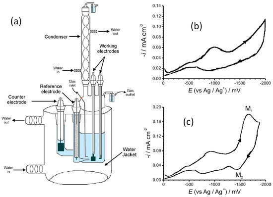 (a) Electrochemical cell used for electrolysis of metal–porphyrin compounds in polar non-aqueous solvents. (b) Cyclic voltammograms of mesotetraphenyl in THF/LiClO4/MeOH/HClO4 solution on platinum, voltage change rate of 50 mV/s, ambient conditions. (c) Cyclic voltammograms of vanadyl mesotetraphenyl at the same conditions. M1 reduction wave at −1 V is associated with direct electron transference to the porphyrin nucleus and is reversible. M2 is related to metal oxidation and is not fully reversible. Reproduced from ref [23] with permission from Elsevier.