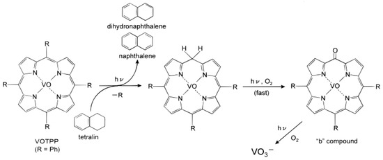 The proposed photodecomposition pathway for vanadyl (IV) tetraphenylporphyrin by photoirradiation to the tetralin + vanadyl (IV) tetraphenylporphyrin/water two-phase system [32] (reproduced with permission).