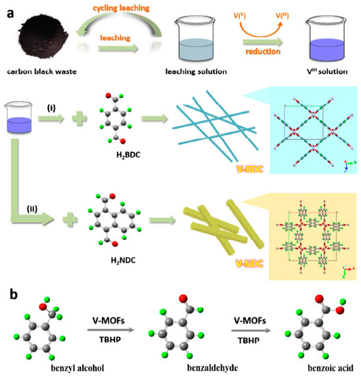 (a) Schematic illustrations of vanadium recovery from carbon black waste into V-MOFs: (i) synthesis of vanadium–benzene dicarboxylate, and (ii) synthesis of vanadium–naphtalenedicarboxylate nanorods. The cycling leaching process represents the usage of the first leachate as a leaching agent in order to increase the concentration of vanadium in the second leachate. (b) The reaction route of catalytic benzyl alcohol oxidation over the vanadium-MOF catalyst. Color codes in molecular structures and ball–stick models: green balls (hydrogen atoms), gray balls (carbon atoms), red balls (oxygen atoms) and pink balls (vanadium atoms). (Reproduced from ref. [57] with permission from ACS).