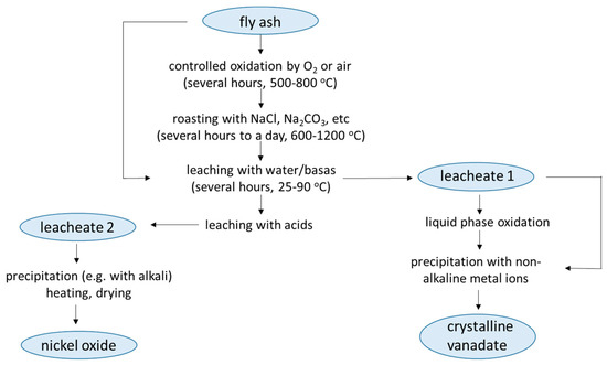 Volkov et al. [82] published a detailed analysis of HOFA roasting with Na2CO3 followed by aluminothermic melting. The process leads to a “slag” enriched with V, Ni and Fe in various forms (NaMg4(VO4)3, NaVO3, CaxMgyNaz(VO4)6; (FeV2O4), V2–x–y–zFexAlyCrzO3, Mg1–x–y–zNixFeyVzO). The metals were leached with either acid or base solutions. Leaching from the slug was far more effective compared to the direct leaching from the HOFA source (72.3–96.2% V and about 90% Ni was recovered with H2SO4). A somewhat similar method was previously applied to vanadium-containing sludge, which is a byproduct of vanadium pentoxide obtained by hydrometallurgical methods. Vanadium was mostly in the FeO∙V2O3 form. The authors explored various oxidation roasting methods for a sludge treatment to facilitate vanadium extraction. Oxidation roasting of the sludge at 1000 °C with 1% CaCO3 increased the acid-soluble V2O5 from 1.5% to 3.7% and lowered the content of FeO∙V2O3 from 3% to 0.4% [117]. Vanadium and nickel from flexicoking waste were isolated by Queneau et al. [118] by pressure oxidation: steam with a pH = 9.5 was supplied under pressure in an industrial-type facility. Exothermic reactions produced enough steam to generate enough electricity to make the process self-sustainable. Vanadium and nickel are concentrated in some kind of ash in carbonate forms and converted to high purity salts and then oxides with extraction and crystallization. The general scheme of vanadium and nickel extraction from fly ash is shown in Figure 6.