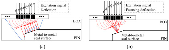 When there is a phase difference between the ultrasonic beams emitted by different elements, they interfere with one another and superimpose the medium to create wavefronts with different forms, allowing for the measurement of specimens with different shapes. For the cone-to-cone metal sealing interface, the ultrasonic phased array probe can transmit the deflection wave through the linear delay rule [30], and the formed wavefront is parallel to the sealing interface, as shown in Figure 3a. The sound beams from the sealing interface will be vertically reflected and received. Another method refers to combining linear and symmetrical delays to the incident of the focusing-deflection waves vertically at the sealing interface. The concentrated sound beam produced by a group of elements is shown in Figure 3b. There are usually multiple sets of such focused acoustic beam scanning detection objects, and the reflected signals of these beams carry reflected waves from the sealing surface.