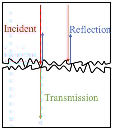 The ultrasonic phased array probe can be equivalent to the combination of traditional ultrasonic probes with the same number and size as the element. Ultrasonic propagation at the contact interface is affected by contact stress, surface roughness, clearance medium, and other factors [35]. The larger the contact stress is, the smaller the surface roughness is, the closer the sound velocity and density of the gap medium are to the contact body, and the more the ultrasonic wave is transmitted at the contact interface, the less the corresponding reflected wave is. The deformation of the micro-convex body on the rough surface at a particular contact surface leads to the growth of the true contact area with an increase in contact pressure [43]. In the contact part, as depicted in Figure 4, ultrasonic transmission is practically finished, and reflection takes place in the uncontacted part. As the interface contact stress increases, the reflected ultrasonic energy steadily declines. At present, the correlation between the contact stress and the reflection coefficient of the interface does not have a unified model, so it needs to be built by calibration experiments.